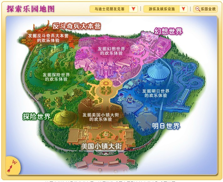 香港迪士尼乐园分为:美国小镇大街、明日世界、幻想世界、反斗奇兵大本营与探险世界五大主体园区。