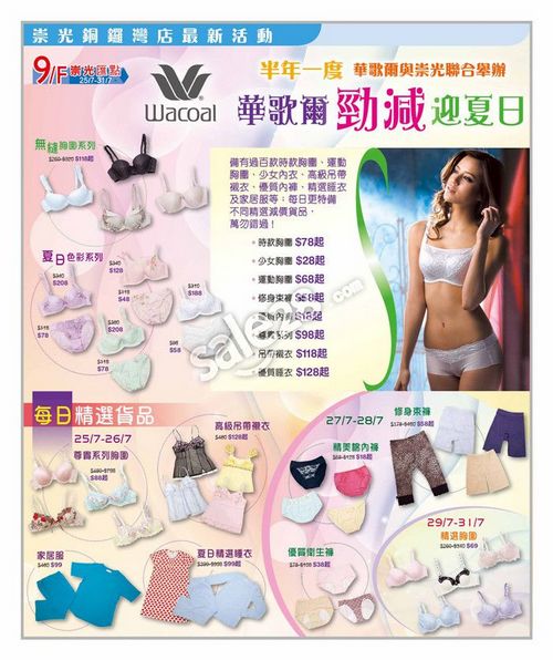 半年一度的华歌尔内衣劲减活动在这个夏日热力开场了!华歌尔是日本内衣著名品牌,它会根据亚洲女性的体形特征,设计和生产出时尚、舒适且适应亚洲女性需求的内衣服饰。所以遇到华歌尔内衣联合崇光百货举行的这种减价活动就不应该错过了!全场内衣最低只要HK$78,更有每日精选的服饰供你选择,款式应有尽有,不止内衣还有家居服饰,朋友们赶紧去看看!