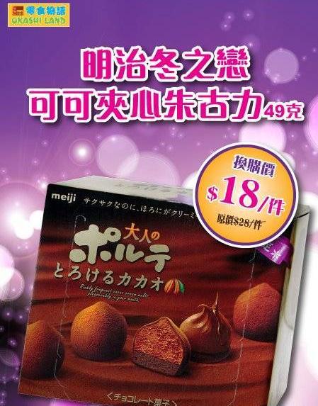 即日到8月9日,零食物语惠顾任何商品加$18就可以换购明治冬之恋可可夹心朱古力(49克)1件。