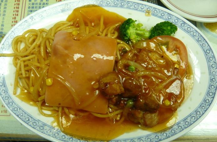 到了之后就是黄昏了,饿了,找地方吃东西,香港的茶餐厅应该是可以作为香港食文化的标志。茶餐厅有多以烧腊的盖饭为主,很地道。上图,有图才有真相。