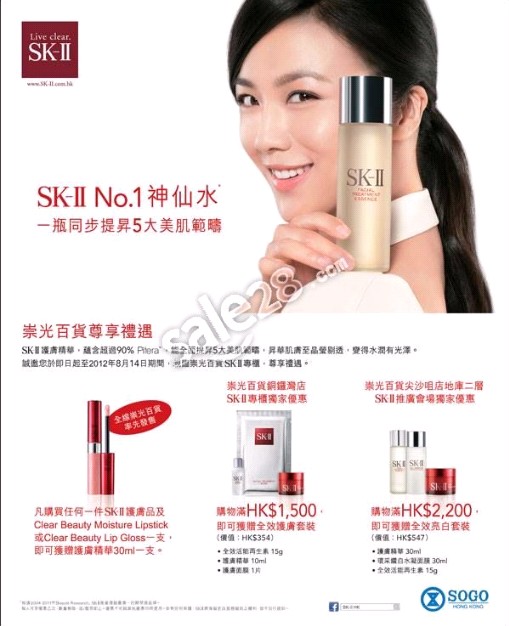 SK-II神仙水含有高达90%以上的富含多种营养成分的PiteraTM酵母精华,每天为肌肤提供充足营养并调理肌肤。现在来崇光百货购买SK-II神仙水有礼物拿哦!购买任何一件SK-II护肤品及Clear Beauty Moisture Lipstick或Clear Beauty Lip Gloss一只,即可获SK-II护肤精华30ml一只,除购买SK-II神仙水货品外满指定金额还送护肤套装。