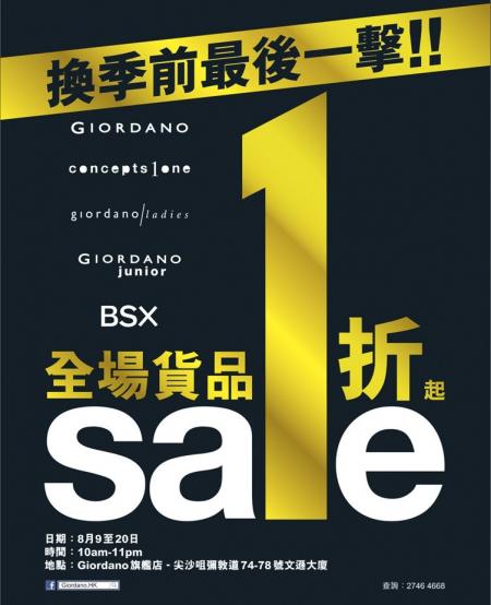 (9/8)至20号,尖沙咀文逊大厦Giordano旗舰店举行换季前大减价!!! 全场所有品牌货品低至1折,最后一击啦,快d嚟扫货啦!