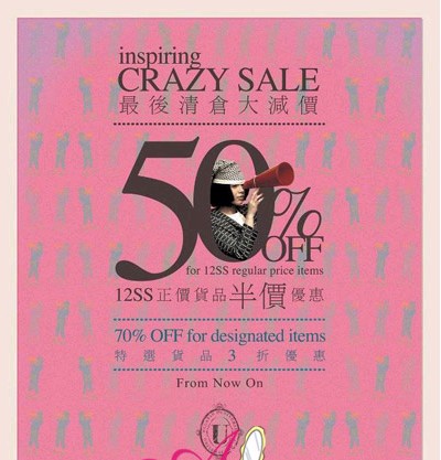 【香港打折】由1/8起uuu…shooop!!!所有春夏货品50%OFF,指定货品更低至70%OFF,踏入最后阶段,真的不容错过!另The ONE卡会员更可于客户服务部换取积分时,获得uuu…shooop!!! $100 coupon乙张!