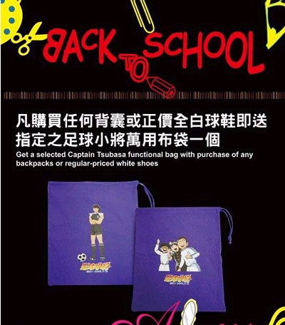 【香港打折】购买任何BaCK to School背囊/ 正价全白球鞋即送足球小将万用布袋一个。
