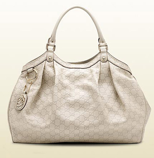 此款为“sukey”大号手袋,配以可拆分双 G 互扣式吊坠。采用浅白色的guccissima 牛皮,配以浅白色真皮滚边,以及浅金色配饰,完美地再现了GUCCI的经典奢华。
