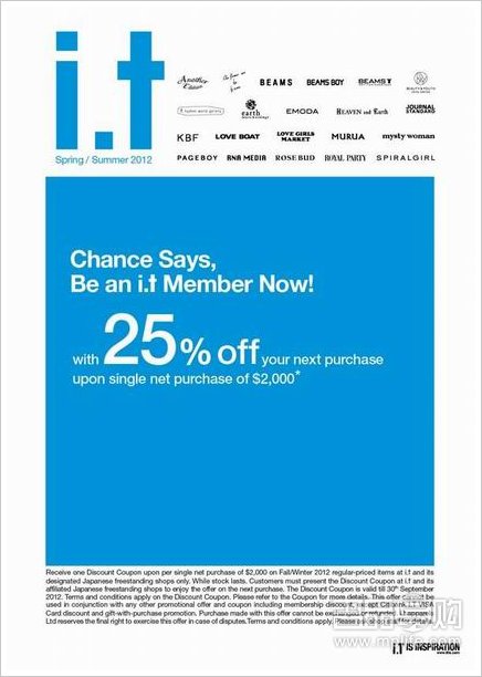 *于下列i.t及旗下指定日本品牌专店购买2012秋冬正价货品,每单一消费净价满$2,000,即可获得优惠劵乙张。数量有限,送完即止。
