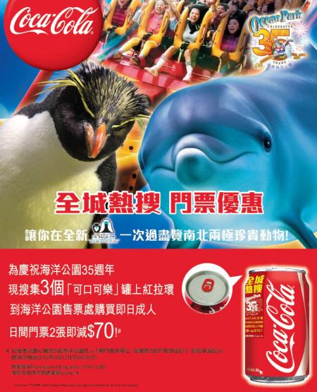 详情:為庆祝海洋公园35週年现收集3个「可口可乐」罐上红拉环到海洋公园售票处购买即日成人日间门票2张即减 $70!!