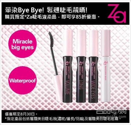 由24/8起购买Za睫毛液同指定多元水活系列产品有85折优惠!优惠期由24/8-30/8。
