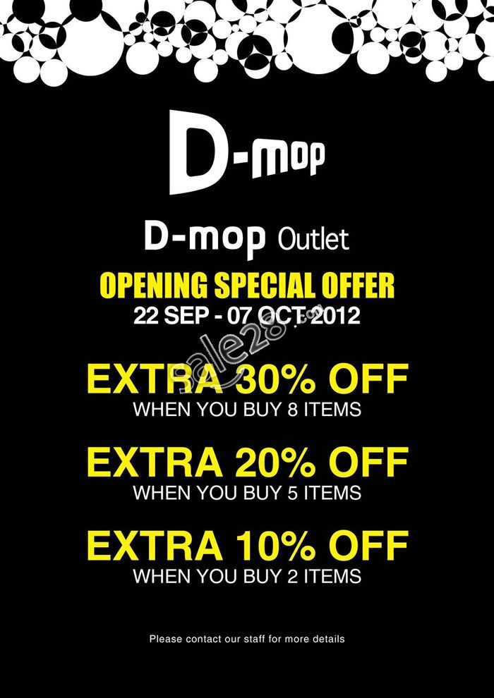 当当当!东荟城D-mop Outlet开幕啦!从第一间D-mop Outlet开张以来就成为大家淘宝的必去之处,除了D-mop Outlet内真的聚集了Mihara Yasuhiro、Hussein Chalayan、Y-3等时尚品牌外,价格也是平时的几乎一半,所以趁着东荟城D-mop Outlet新开张,赶紧去看看!购买任何两件产品可享额外9折优惠,五件或以上8折,八件或以上7折,大家不要错过啦!