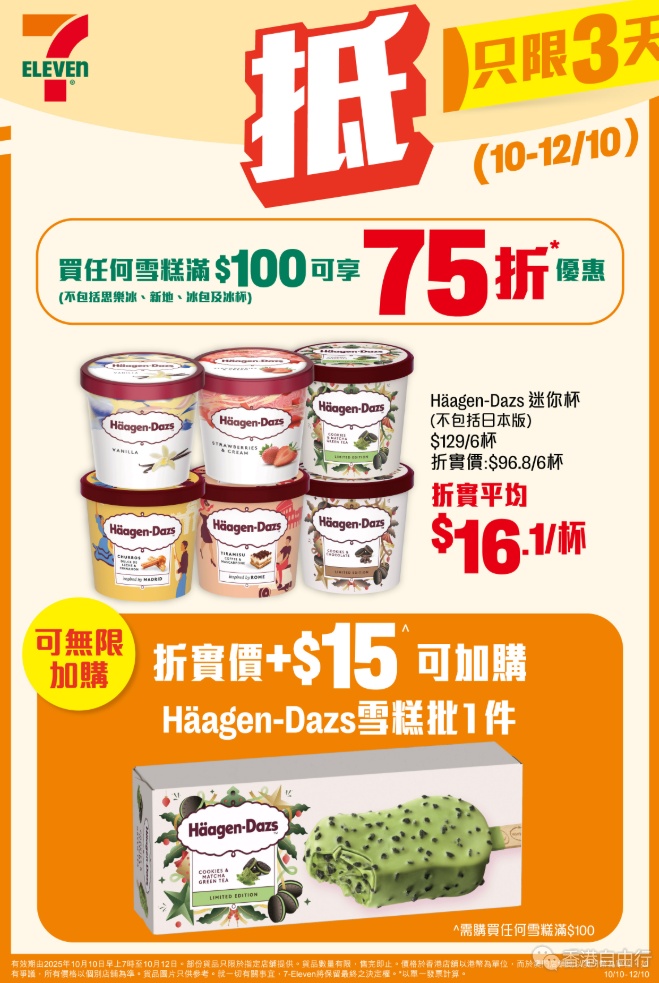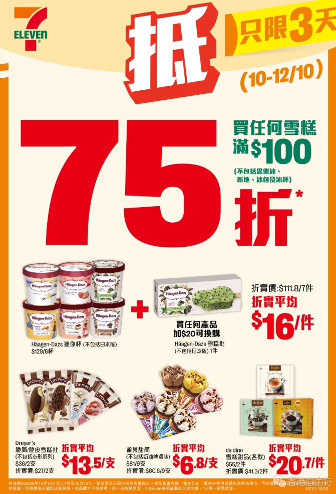 召集所有雪糕控!7-Eleven今日(10日)重磅推出限时优惠。即日起至10月12日,于全港7-Eleven店舖单笔消费满$100雪糕产品,即享75折超值折扣!