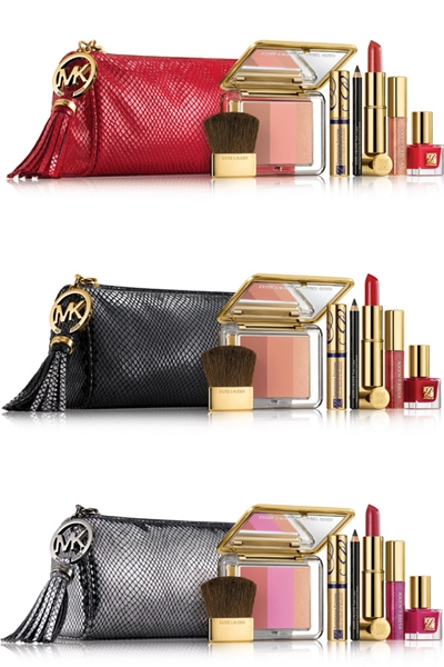 首先来看与Michael Kors合作推出的组合,一共有三款,不过内容物其实大同小异,差别在于内容物颜色搭配不同。化妆包上同样有着MK的经典Logo拉鍊,裡头有三色修容饼、睫毛膏、唇膏、纯蜜、眼线笔与指甲油 ,相当实用。这款目前定价48英镑,预计11月起在国外雅诗兰黛专柜贩售。