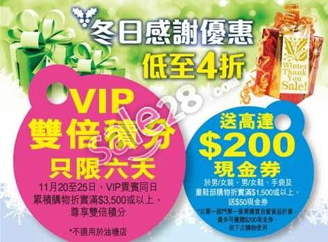 到了冬季,有什么比购物商场打折更温暖人心的事情呢?尤其遇到像香港先施百货冬日感谢优惠这种大型的活动,更是令人激动的事情啦!香港先施百货是香港历史最悠久、享誉最隆的百货公司之一,也是很多朋友们去香港最喜欢逛的商场之一,这次香港先施百货冬日感谢优惠,精选货品低至4折,另于指定部门购物折实满HK$1500即送HK$50现金券。同日买满HK$3500就会有VIP双倍积分优惠哦!大家快去香港先施百货看看吧!