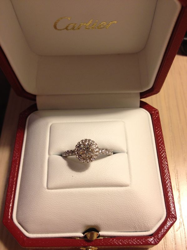 钻戒:太古广场购买。说到钻戒有点喜剧色彩,因为钻戒一直是看的tiffany的,从没看过卡地亚,这次去tiffany说那颗54000的已经卖掉了,只有73000的和11w多的,顿时失望,到隔壁卡地亚看婚戒时突然看到这颗最新款,整体一克拉,而且做工感觉比tiffany的要好很多,果断拿下。