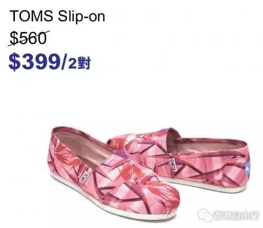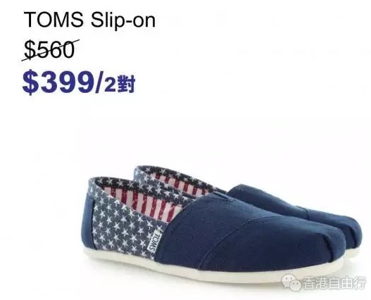 指定休闲鞋如Vans、Toms Slip-on HK$399两双。