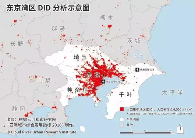 DID(Densely Inhabited District)是日本政府国势调查中对城市人口的定义,即每平方公里4千人以上连片的人口密集地区。日本的DID人口比率可以理解成为中国所说的城镇化率,只是定义更严密一些。目前DID人口比率,东京都已高达98.2%,东京大都市圈也达89%,日本全国为67.3%。