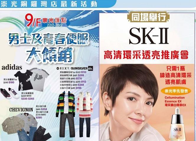 如果你经常来香港购物,那你对崇光百货一定不会感到陌生,而香港崇光百货9楼的崇光汇点则是经常举行名牌服饰打折的地方,一直持续到本周末的包括Lee、Adidas等男士及青春便服减价活动就在香港崇光百货的9楼进行中,最低只要3折就能买到心仪服饰,同场还有SK-II推广活动,都不同错过!