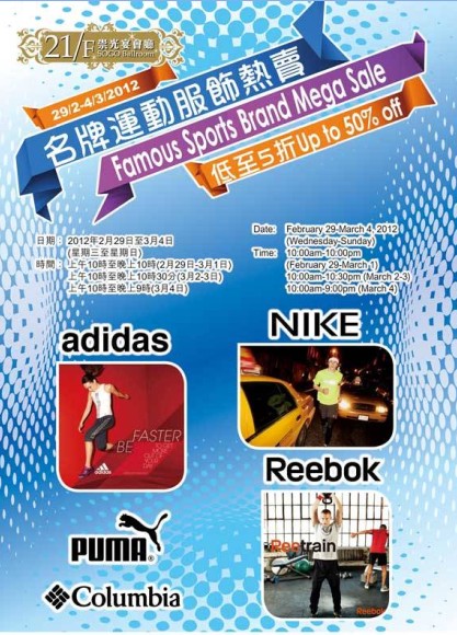 香港崇光百货铜锣湾店最新折扣:名牌运动服饰热卖5折,品牌包括:adidas,nike、puma、reebok的,快去崇光看看有没有喜欢的吧!