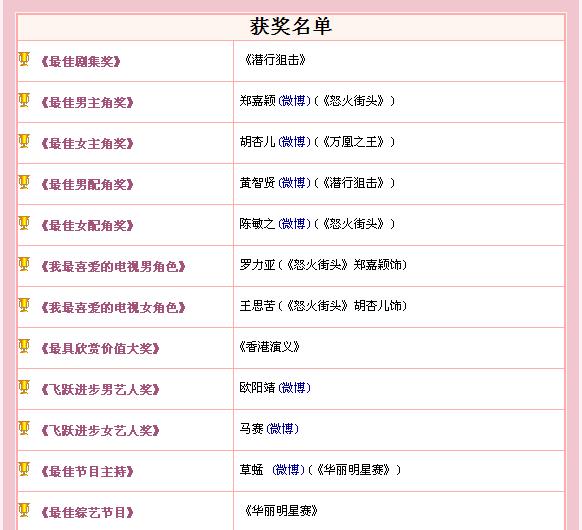 TVB2011万千星辉颁奖典礼完全获奖名单