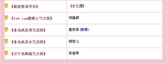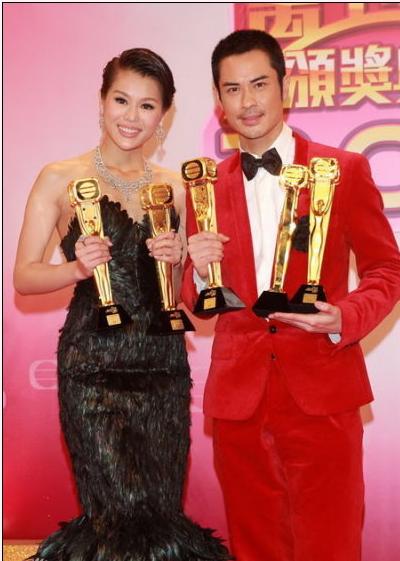 另外,在TVB花旦青黄不接的情况下,一身黑色羽毛装的胡杏儿远远抛开陈法拉等对手,以“万凰之王”的姿态收获“最佳女主角”、“我最喜爱的女角色”以及“非凡风采女艺员”,成为三料视后。刚封视后,胡杏儿马上甜蜜蜜公开承认和黄宗泽的恋情,并发表一段爱的宣言,“我知道我有很多缺点,也很难顶,其实你都好多缺点好难顶,不过希望我们一路顶住啦。”而黄宗泽虽然拒绝上前亲吻胡杏儿,不过承诺会一直“顶”(支持)胡杏儿。