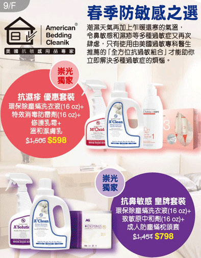 抗鼻敏感皇牌套装$798(原价$1454),包括:环保除尘满洗衣液+致敏原中和剂+成人防尘满枕头套。
