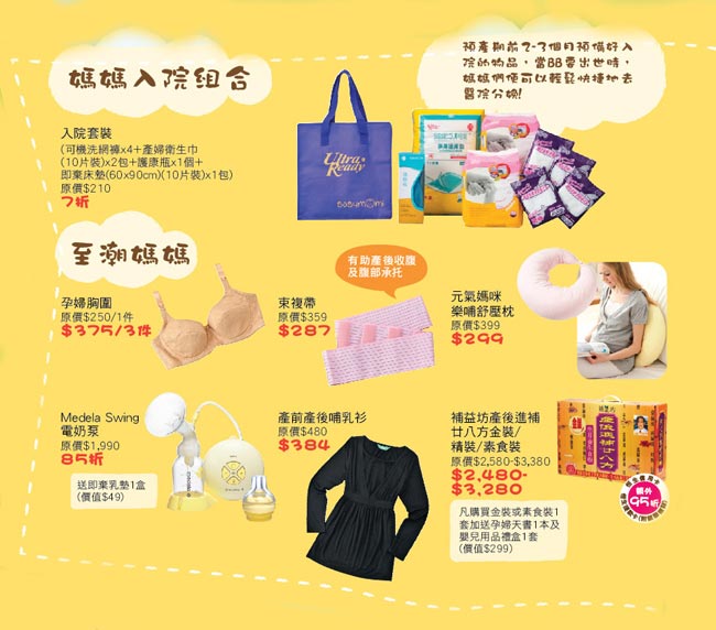 妈妈入院套装(4件可机洗网裤+2包产妇卫生巾+1个护康瓶+1包即弃床垫)7折(原价$210);