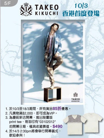 TAKEO KIKUCHI铜锣湾店 所有货品85折