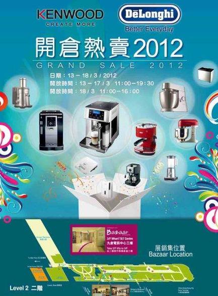 DeLonghi KENWOOD 开仓热卖 2012年3月13日至3月17日(星期二至六) 上午11时 至 晚上7时30分 2012年3月18日(星期日) 上午11时 至 晚上4时 品牌包括:DeLonghi 及 KENWOOD