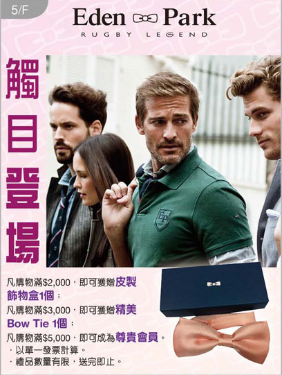 [崇光百货] Eden Park铜锣湾店凡购物满$2000,即可获赠皮制饰品盒1个;凡购物满$3000,即可获赠精美Bow Tie 1个;凡购物满$5000,即可成为尊贵会员。(以单一发票计算,礼品有限,送完即止)