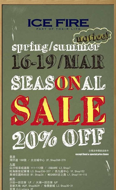春夏的Seasonal Sale又到了!全店八折优惠,限定四天(16th-19th March)。