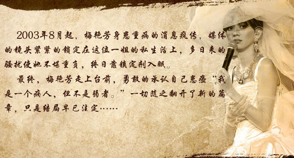 2003年8月起,梅艳芳身患重病的消息疯传,媒体的镜头紧紧的锁定在这位一姐的私生活上,多日来的骚扰使她不堪重负,终日靠镇定剂入眼。最终,梅艳芳走上台前,勇敢的承认自己串癌“我是一个病人,但不是弱者。”一切随之翻开了新的篇章,只是结局早已注定...