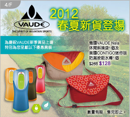 为庆祝VAUDE新季货品上场,特别为您呈现以下优惠套装:德国VAUDE Nala休闲斜背袋1个及美国CONTIGO迷你版防漏按钮水瓶1个。特价$128(原价$288)