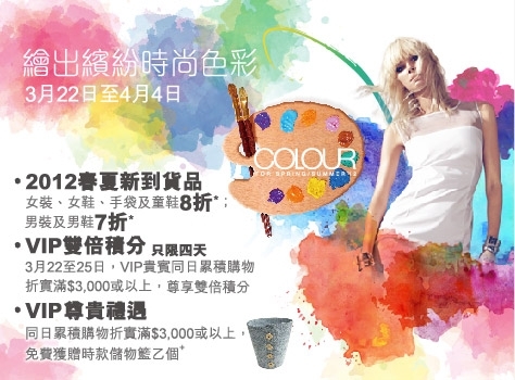 3月22至25日,VIP同日累积购物折实满$3,000,尊享双倍积分(只限四天);