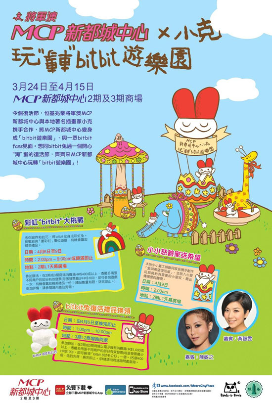 在MCP新都城中心2期或3期商场以电子货币消费满$1,000或以上,凭最多两张不同商户的即日有效发票(每张发票最少$100),即可换领「bitbit 8吋毛公仔」一个。