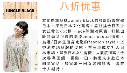 日系品牌JUNGLE BLACK服饰8折优惠。(沙田店2楼女裝部)