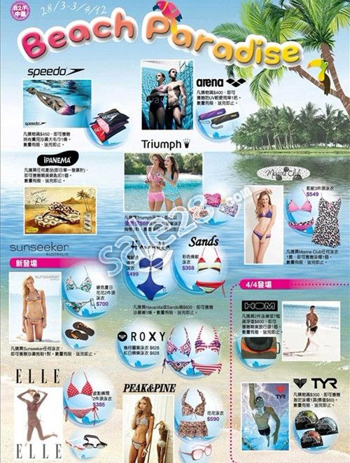 夏天很快就会来了,各位帅哥美女准备好了吗?!香港尖沙咀崇光百货为您倾心准备了各种夏日沙滩休闲活动用品,ELLE、Speedo、Arena、Triumph 、Roxy,沙滩鞋、比基尼、泳裤泳衣,琳琅满目,各种沙滩用品优惠给力发售中,你还等什么?!小编给大家提供详细的优惠折扣,快点来看看有没有你钟意的!