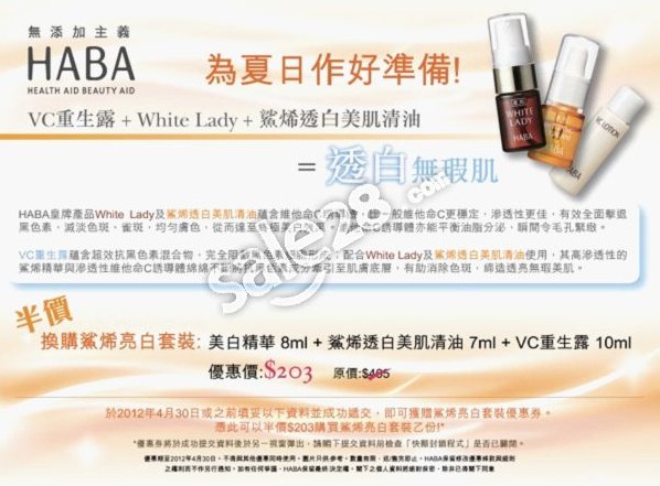 优惠内容:登陆Haba网页登记有关资料,即可半价换购「鲨烯亮白套装」(美白精华8ml鲨烯透白美肌清油7ml + VC重生露10ml 优惠价$203 ,原价$485)