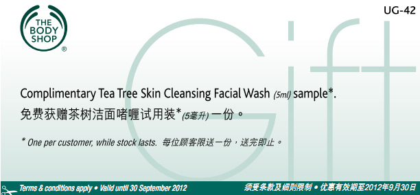 又一城UG-42号铺,The Body Shop美体小铺 ,免费获赠茶树洁面啫喱试用装(5ml)一份。(每位顾客限送一份,送完即止)