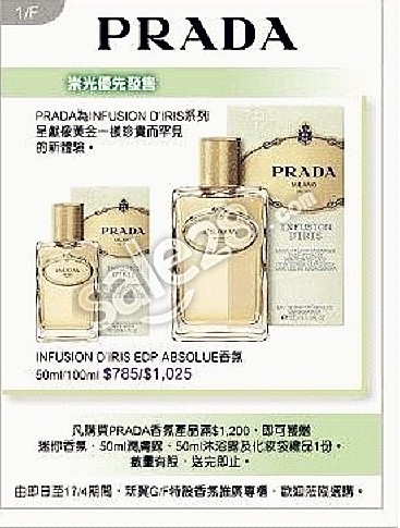 PRADA为INFUSION DIRIS系列呈献像黄金一样珍贵而罕见的新体验,香港铜锣湾崇光百货独家优先发售,凡购买PRADA香水产品满$1200,即可获赠迷你香水、50ML沐浴露及化妆包礼品1份。还在香港的朋友,就记得去捧场香港PRADA香水优惠送礼的现场咯!