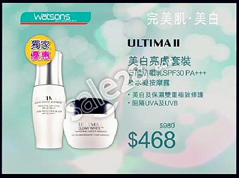 优惠内容:原价$980的ULTIMA II Clear White美白亮肤套装特价$468,包括极致活肤亮白日间防晒乳SPF 30 PA+++及美白水凝按摩露