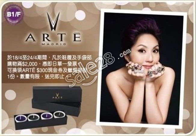优惠内容:凡在鞋履及手袋部购物满$2000,凭即日单一发票,可换领ARTE$300现金劵及蜡烛摆设1份