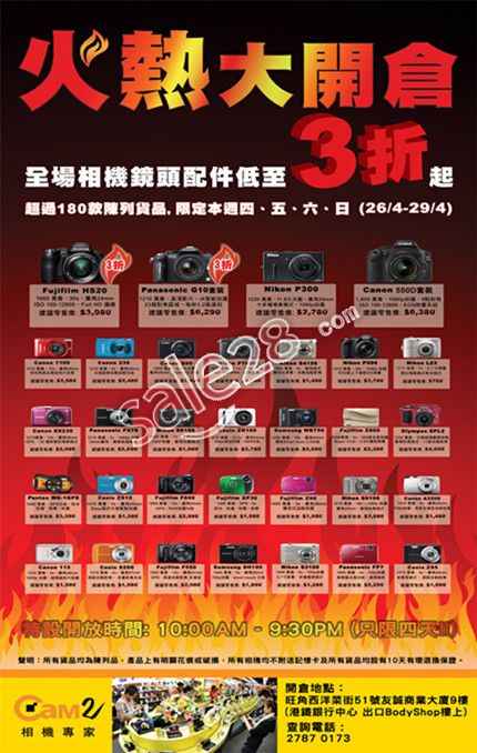 各位数码相机发烧友,去香港购买数码相机优惠最低3折起,Conan、Nikon、Casio、Samsug、Fujifilm、Panasonic、Olympus...多款数码相机及配件、零件劲减3折。这个活动的举办方Cam2是香港大型行货相机连锁店,主要经营各个世界知名的相机品牌,提供及发售过千种专业相机器材及相机配件。绝对是摄像发烧友不容错过的去处。