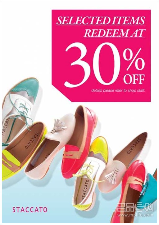 STACCATO推出优惠凡购买任何货品可以七折价钱换购指定货品!! 指定货品中有舒适的平底鞋及矮踭鞋,也有型格的loafer鞋,快D为夏天做准备啦~~~