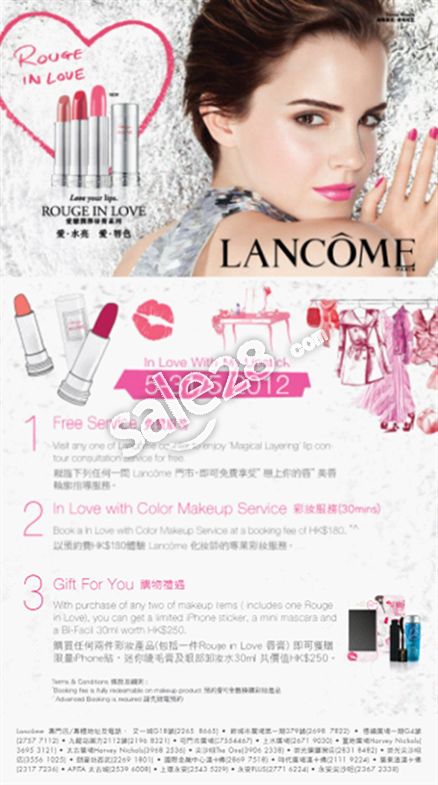 3.购物礼遇购买两件彩妆产品(包括一件Rouge in love唇膏”)即可获赠限量iPhone贴,迷你睫毛膏及眼部御妆水30ml,共价值$230
