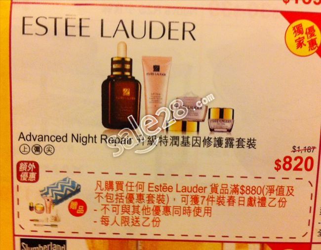 想购买雅诗兰黛升级特润基因修复露套装吗?来香港永安广场吧!雅诗兰黛优惠大放送,原价HK$1187的雅诗兰黛套装现在特价只要HK$820, 另购物满HK$880还可获赠雅诗兰黛优惠一套7件礼物套装。各位美女们还在等什么?快去香港雅诗兰黛优惠现场抢购吧!