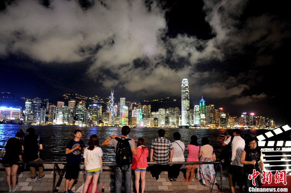 5月17日晚,大批游客在香港维多利亚港观看绚丽多彩的夜景。维多利亚港两岸的夜景与日本函馆和意大利那不勒斯并列世界三大夜景,由于香港岛和九龙半岛高楼大厦满布,入夜后万家灯火,相互辉映。王东明 摄