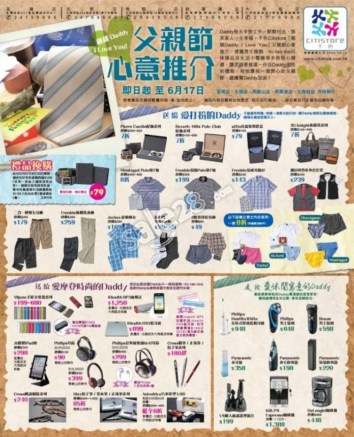 相信很多朋友都在为6月即将到来的父亲节而烦恼,到底父亲节送什么礼物好呢?来香港千色Citistore看看吧!千色Citistore「亲亲Daddy I Love You」父亲节心意推介,搜罗男士服饰、tic-tac-toe玩味精品及生活小电器等多款贴心精选,低至7折,让您细意挑选一份合爸爸个性的礼物,和他庆祝 一个开心的父亲节,继续帮爸爸加油哦!