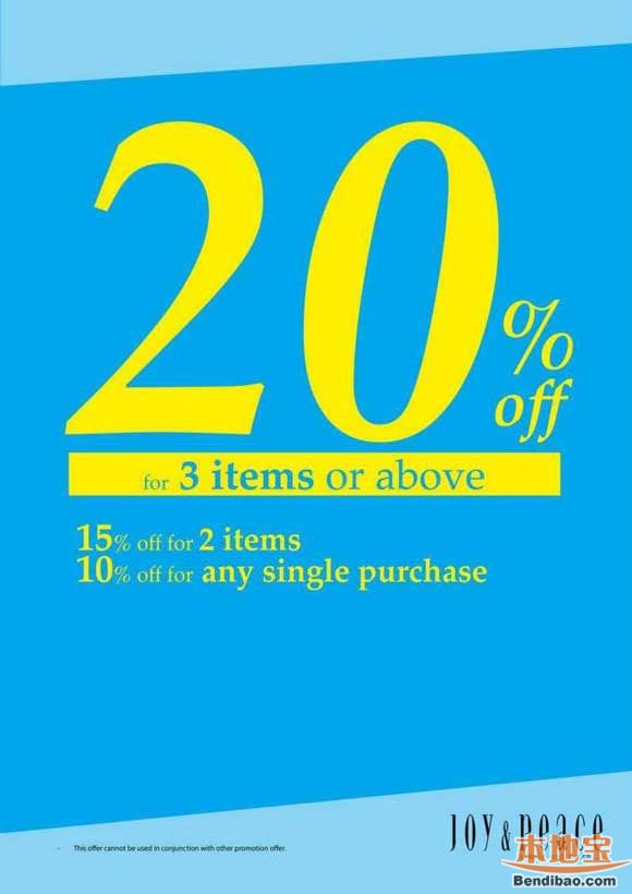 六月优惠惊喜不绝,由即日起到Joy & Peace购物即享9折优惠,买两件货品即享85折,三件或以上仲有8折呀!