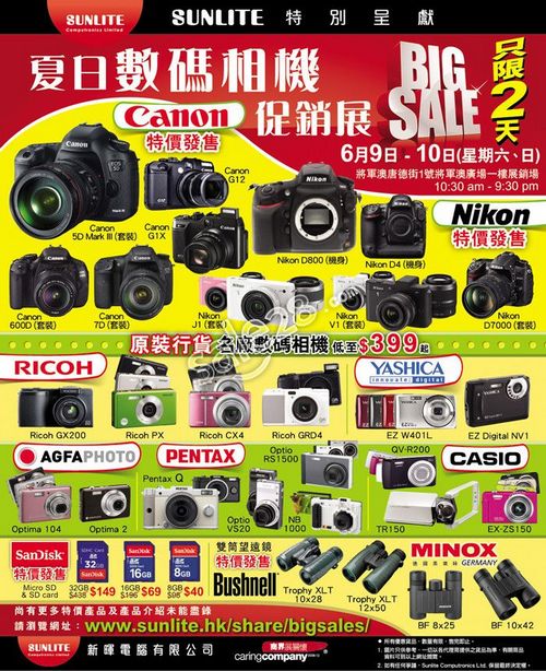 HK$399就能买到数码相机?!没有和大家开玩笑哦!只要在这个周末去香港Sunlite逛逛,就能享受这样超低的价格啦!香港Sunlite夏日数码相机促销,精选了佳能、尼康等品牌的单反相机以及多款数码相机,脚架,SD,Micro SD记忆卡等,应有尽有!想要购买数码相机或者摄影发烧友们都不可错过哦!仅限周末2天,抓住机会!