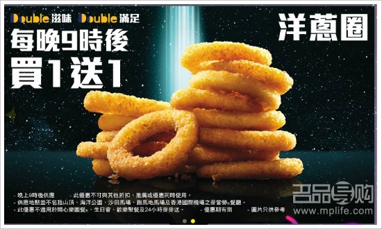 香港麦当劳9点后大薯条,洋葱圈买1送1优惠!
