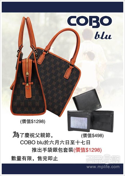 为庆祝父亲节,COBO姊妹品牌COBO Blu于6月6日至17日推出手袋银包套装优惠,指定款式连银包手袋套装只需$1,298,拣选礼物时又能奖励自己,一举两得!数量有限,售完即止!